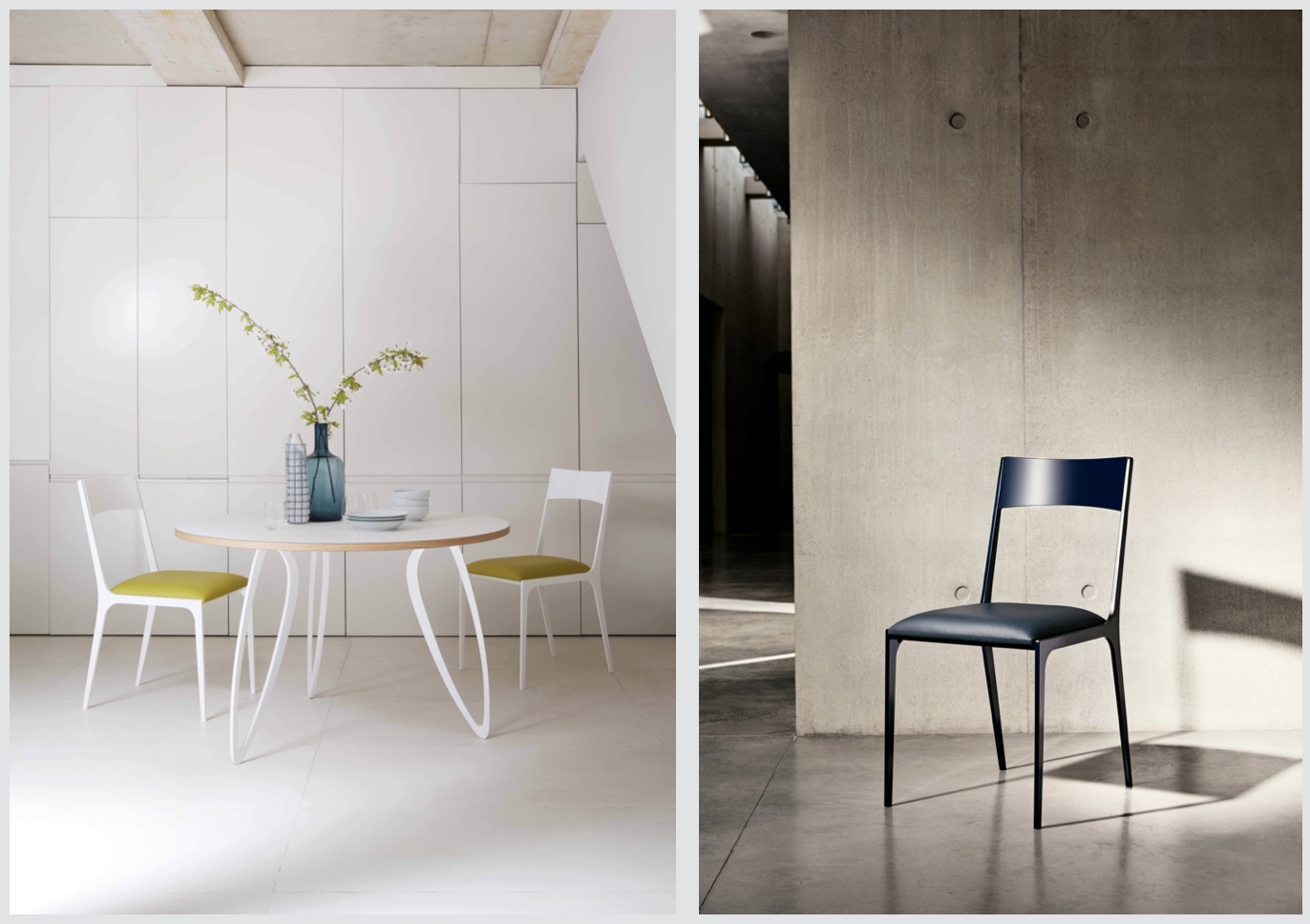 Left: Jak chairs finished in ‘Chalk’ with ‘Lime’ upholstery + Atlantic round dining table finished in ‘Chalk’ with oak lipping | Right: Jak chair finished in ‘Ocean Blue’ with ‘Atlantic Blue’ leather