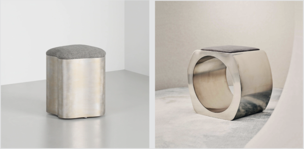 Left: Lily stool finished in ‘Persian Silver’ with upholstery | Right: Skye stool finished in ‘Satin’ polished stainless steel with upholstery