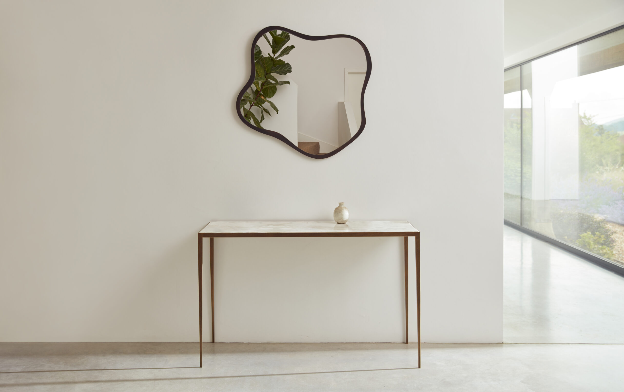 The Lily mirror and Flint console is one of our favourite combinations. Lily’s soft, aqueous silhouette balances perfectly against Flint’s crisp, delicate framework. While the two diverge in shape, they share a sense of dynamism. The mirror’s frame varies in width, flaring and contracting at each turn. The console’s legs are elegantly tapered, infusing the piece with a certain fineness and levity. Our Lily mirrors come in three sizes, which we often recommend combining as a trio. However, in this case, we think going bold with the largest standard size creates a clear and cohesive statement all on its own.
