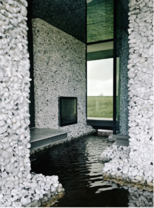 There’s a sense of unity that comes from the intentional integration of pieces like a dining table designed by Jacob, which displays an artful arrangement of flint stones encased beneath the glass top. It’s details like this that, as intended, create a conversation between the land, the architectural exterior, and the decorative interior. The dining table is strategically placed in a visual thoroughfare, with the adjacent floor-length glass pane leading the eye outward across the building’s flint-encrusted exterior, which rises as stony, shale-like steps from the earth.