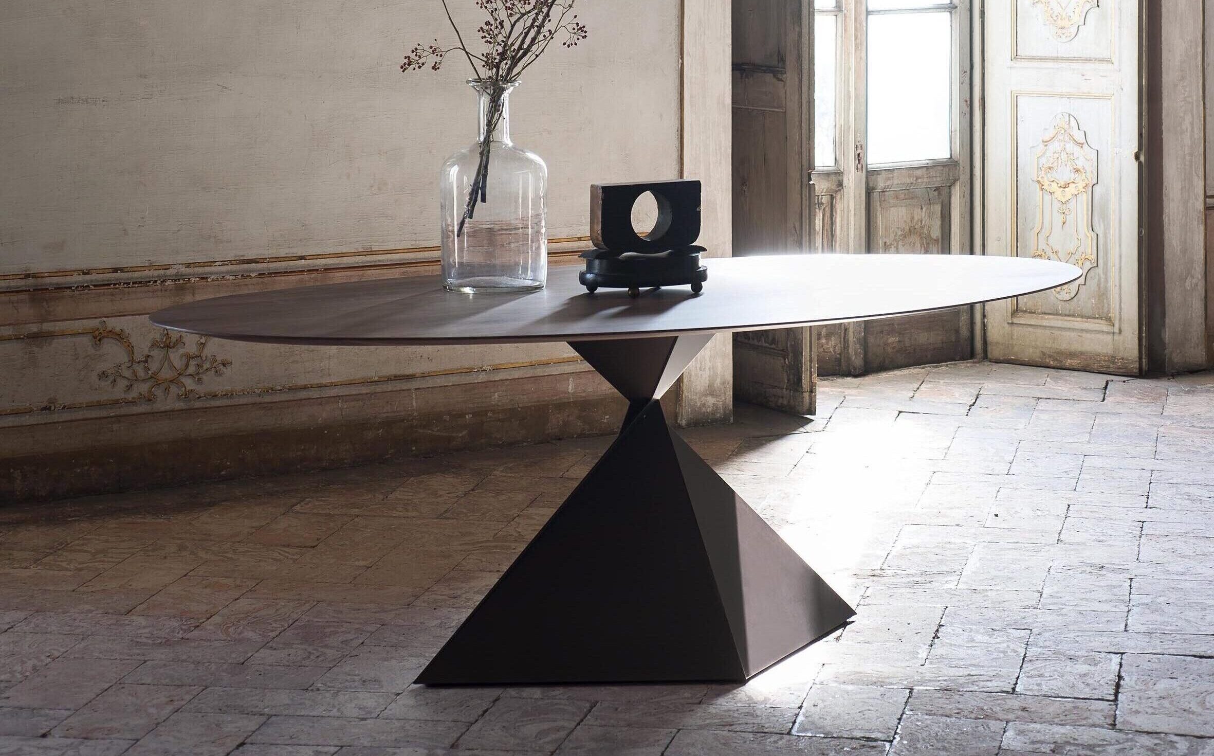 An oval dining table will generally be placed on a pedestal base, as ours are. This adds to the table’s adaptability in terms of numbers and further maximises usable surface area as there are no allowances to be made for table legs in the way of seats. Our soft and sculptural Papillon oval dining table draws together all of these handy attributes in a design-forward package. Pair it with crisp and simple Jak chairs to complete the look. If you’re after a more dramatic, geometric design, our Avebury fits the bill quite nicely.