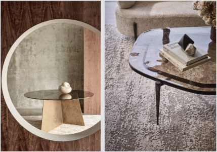 Edge round dining table with a smoked glass top (left) + Cloud coffee table with a ‘Smoke’ Venetian glass top (right)
