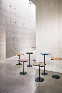 Edge round dining table with a smoked glass top (left) + Cloud coffee table with a ‘Smoke’ Venetian glass top (right)