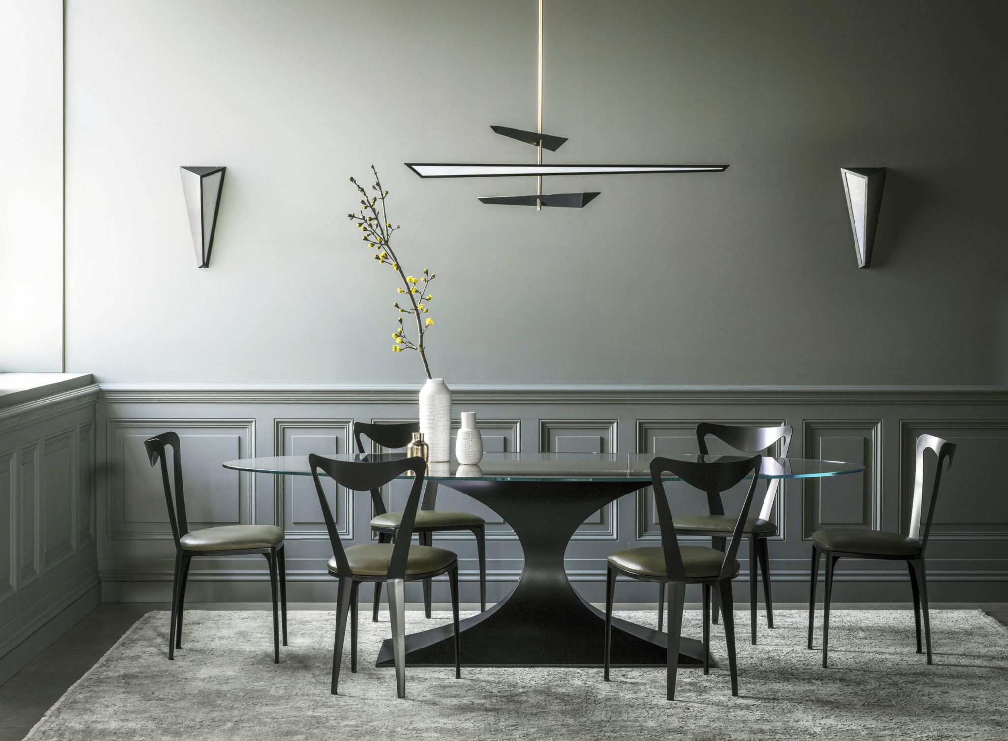 Lighting is an important component to a dining room as it sets the tone and ambience. Statement lights are popular to hang over the table – but make sure they work with the aesthetic of the table and chairs. Scale is an important consideration as well. The size and shape of the lighting fixture should work well against the table. A dimmer switch is a fantastic addition, especially in a dining space as it allows you to reflect the feel of sunset (which is when the room will inevitably be used most). As well as chandeliers, sconces are a much needed addition to a dining room as they’re a great way to create a sense of intimacy for a dinner party.