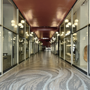 Luigi Caccia Dominioni was a major force of Postwar Milanese Modernism. He worked fluidly across industrial design, furniture design, and architecture, always aiming to create a ‘complete work of art’ in his projects. In 1957 he succeeded with flying colours in the Galleria Strasburgo. He created an arcade connecting two streets, altering the fabric of the city through his use of modern materials set in fluid forms. Continuous, curving walls, elliptical skylights, and rounded glass set a new rhythm for flowing through Italy’s most fast-paced, clear-cut city. The effect is heightened by the abstract mosaic floor created by Francesco Somaini, which adds a languid sort of movement to the space. This collaboration took place at a time when Milan was building itself anew following the bombings of WWII, presenting the opportunity to reimagine a future both bright and bold by harnessing modern modes of design.
