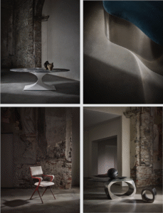 Tom’s designs are rooted in Britain but sparked by a spirit of exploration. Northern Italy is a place he often finds himself, with a calendar of design events in Milan and a constant curiosity for that which lies beyond the city. Our latest photoshoot took place in Como at the Church of Santa Caterina. This is place that wears its heritage proudly, elegantly complementing that with contemporary accents and speaking to the ethos of Tom’s design process. Pieces like our flowing Lily ottoman and monolithic Skye dining table glint in the low light, finding harmony in contrast against the textured walls of an ancient place. The result feels like an apt tribute to the spirit of Modernism in Northern Italy: a drive for reinvention which honours the past, harnesses the present, and fixes an optimistic eye on the future.