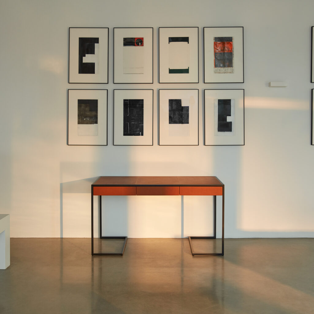 This is a strong and distinctive piece with solid, clean lines. It’s got a simple, geometric quality to it, with crisp right angles composing the slender frame. The Albany desk adds a quiet elegance to both traditional and contemporary environments, with customisable options to create just the effect you’re after. The tactile touches on this piece are what really set it apart, with walnut drawers and a smooth leather body. The steel frame can be finished in any of our standard finishes and combined with a leather colour of your choice, all available to browse here.