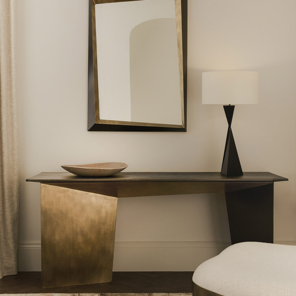 Our AVA table lamp is a genuine showstopper which incorporates a slice of ingenious visual trickery. The metal base comes together as two tetrahedrons balanced one on top of the other, their centre of gravity precisely positioned to create a strong and stable platform. It appears, however, as one cohesive entity, twisted around a central axis. This simple but intriguing geometric form catches the eye and introduces a dash of drama, without overpowering the rest of the room. The AVA table lamp is available in a selection of our standard and specialist finishes, all of which can be seen here. Please note that the listed height does not include a lamp shade.