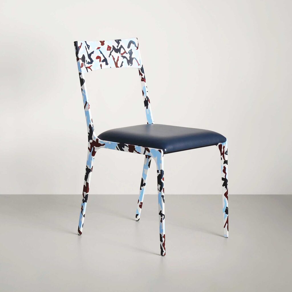 The streamlined simplicity of the Jak Chair lends itself perfectly to this specially painted edition. We worked with Rosie Faulkner – an artist who just so happens to be Tom’s niece – to bring its form to life with a lively display that’s at once abstract and formal. Closer inspection of the graphical combination of blues, whites, and reds will reveal snippets of bodies in motion. Rosie’s clever brushwork pairs wonderfully with the ‘Atlantic Blue’ leather seat, producing a superb piece of functional art.