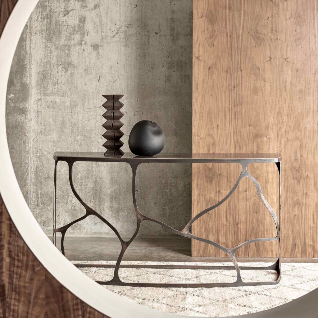 This bronze edition of the Papillon console table may be made to sit at the edges of a room but it’s certainly got the air of a centrepiece. The lightness of its form combined with the gravitas of its material creates an intriguing interplay. Bronze is a distinctive material which opens up a world of options when it comes to patination. Here we’ve created an ‘Autumn‘ patina by hand to produce characterful variations across the console’s surfaces. It pairs beautifully with an Eramosa marble top, tying into its eddies of deep, earthy tones. The frame’s polished edges introduce an eye-catching glimmer which really brings each curve and corner to life. Explore the full Papillon collection to create a cohesive display of contemporary furniture.