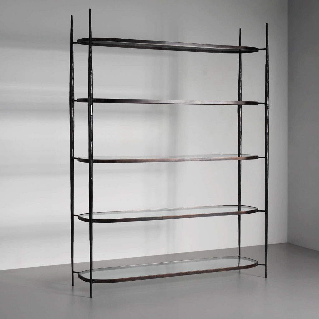 Our Cloud etagere was originally designed to display artworks and craft objects at exhibitions and fairs. We were really pleased with the result, which not only creates a beautiful backdrop for art pieces but contributes an elegant, formal effect. We cast our classic Cloud shape as shelves, with a steel frame which borders crisp, clear glass. They’re supported by sleek spears of metal, forged using traditional blacksmith’s techniques to create a captivating surface and introduce a svelte, tapered shape.