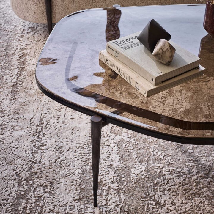 The Cloud sofa marks our first foray into soft furnishing, bringing a whole new character to a quintessential Tom Faulkner design. Its curvaceous, organic shapes were inspired by the rocks which line the beaches of North Devon, a place Tom returns to often. The traditionally sprung seats and backrests echo the forms of rocks shaped by the elements over time. They’re supported by four hammered bronze legs. Shown here in Tom’s choice of Dedar “Per Inciso” in 001 Perla. Available in COM (customers own fabric).