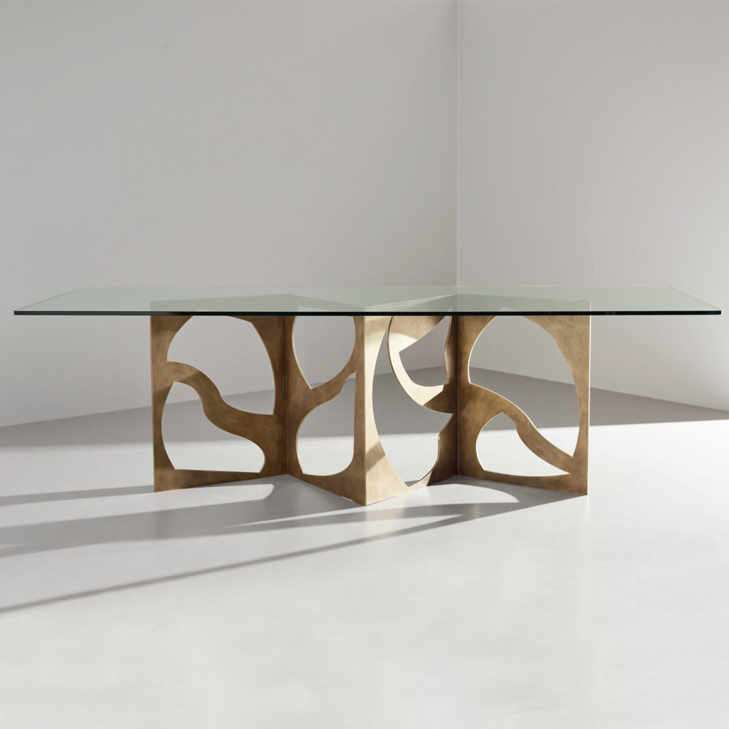 The Eclipse is a contemporary dining table which draws upon many wells of inspiration. The idea began to take shape as Tom noticed the particular beauty of the off-cuts left over from another design. The negative spaces formed a distinctive pattern across each sheet of metal, prompting him to experiment, piecing them together to create this accordion table base. As the design developed, Tom encountered other sparks of inspiration. He noted the influence of Matisse’s iconic ‘Cut-Out’ series as well as the stained glass windows he designed for the Rosary Chapel in Vence, a place Tom has visited several times. The result is an alter-esque glass-topped dining table which brings an artful touch to any environment – a fitting homage to its many muses.
