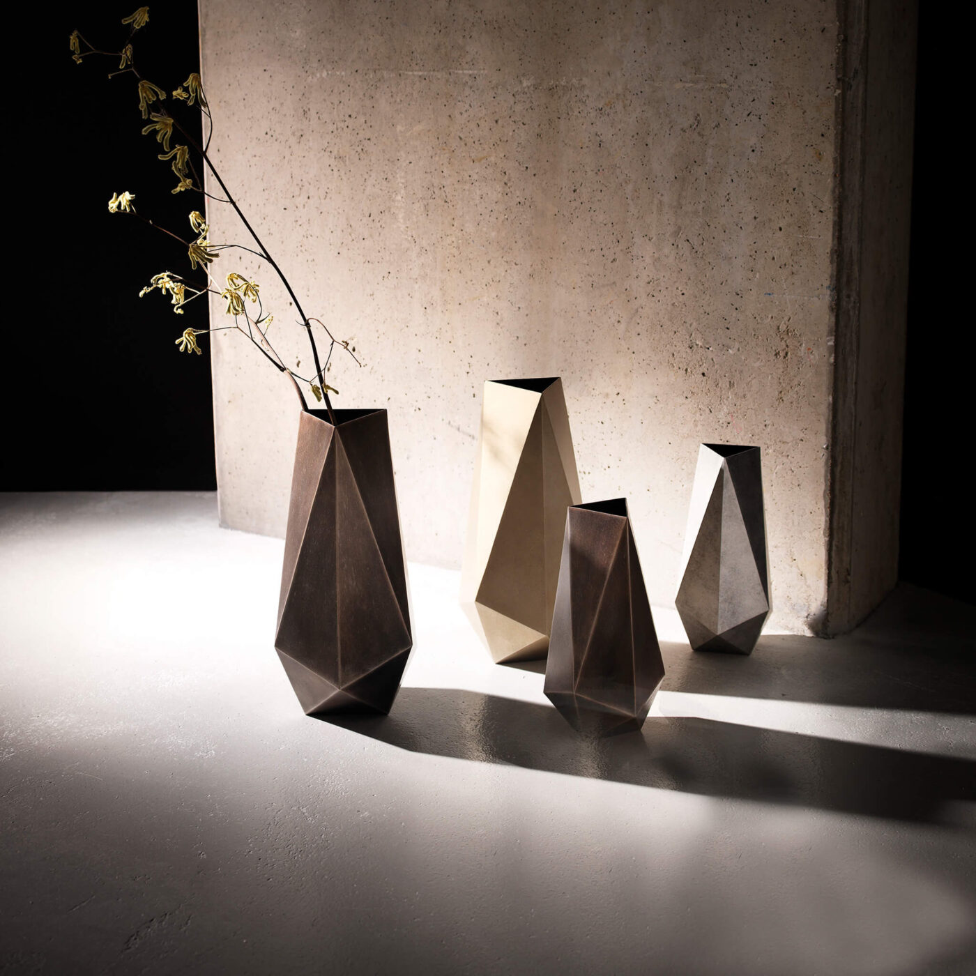 Our Galena vases come together in a confluence of angles and sheer faces, creating a thoroughly modern effect. We can make them in steel, finishing them in your choice of standard or specialist finish. Alternatively, you can opt for bronze, which will be polished by hand to glinting reflectivity.