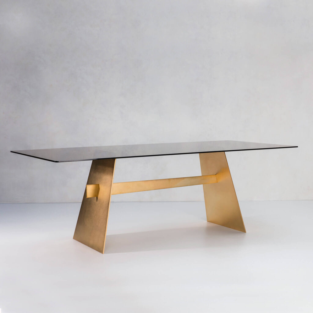 The Edge dining table was inspired by Richard Serra’s sculpture, “The house of cards”, a piece where massive pieces of steel lean against each other. This version of the Edge dining table is similar in that there are no welds at all. It is totally self-supporting with the two end pieces leaning in towards each other and resting on the centre bar.