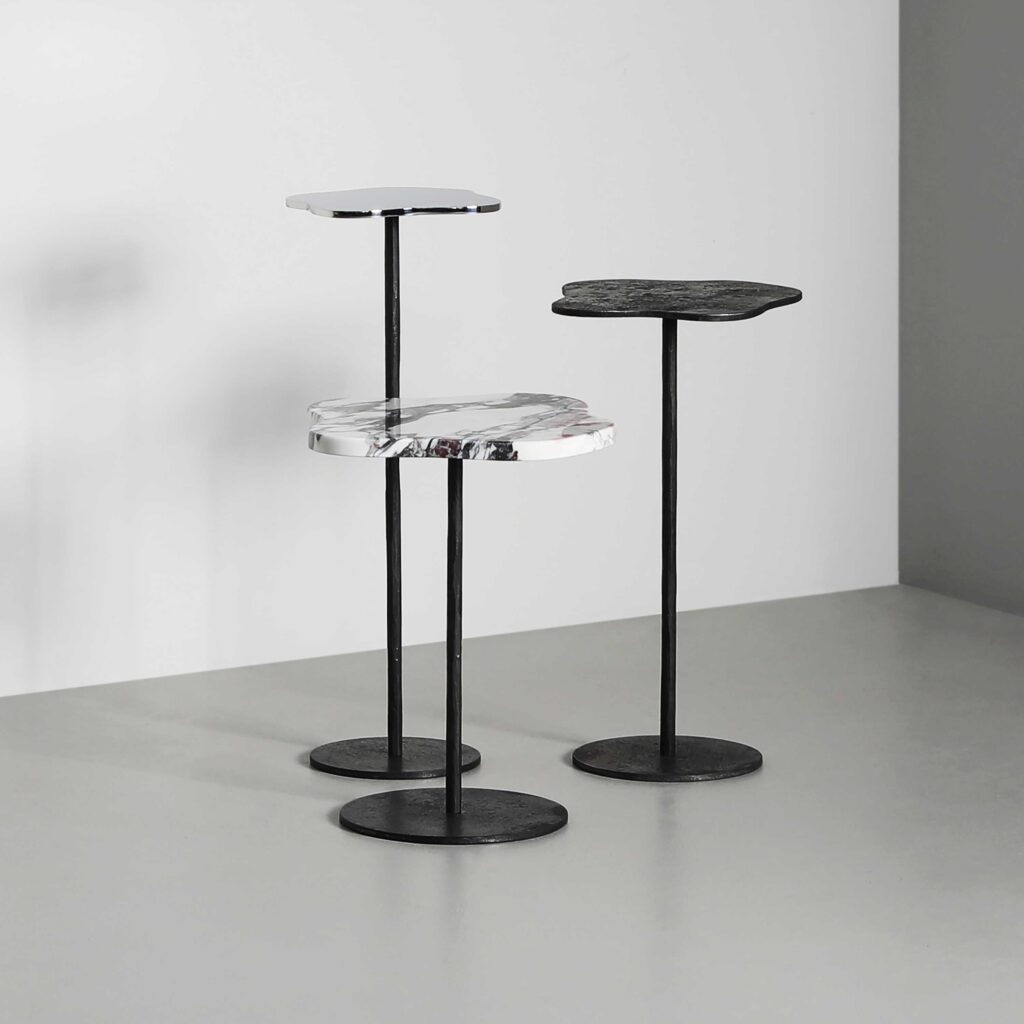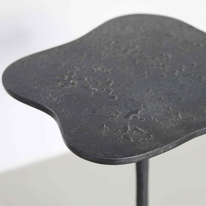 For this version of the Lily cocktail tables, the bases are made in our distinctive ‘Moon’ finish. The tops and bases are created using a traditional blacksmithing technique, which leaves the surface of the steel deeply textured but beautifully smooth to the touch. The stems are similarly treated, giving them a hammered effect. You can find out more about the magic behind the ‘Moon’ here.