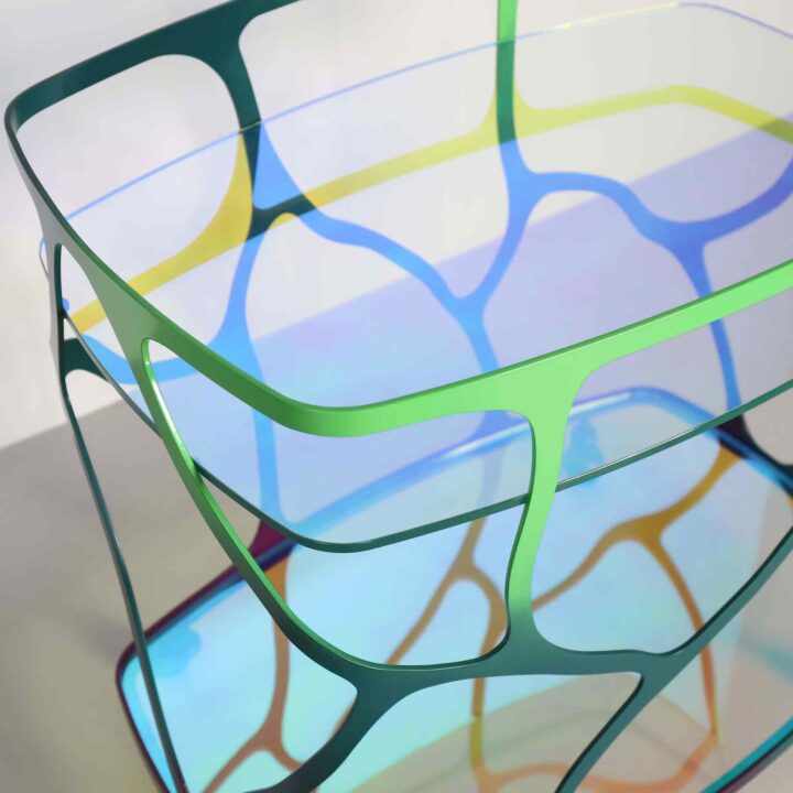 Our Papillon cocktail trolley is a fine friend to those who like to entertain. It’s a supremely functional design that makes hosting a joy, introducing a visually captivating focal point to an evening with friends. This larger rectangular format creates space for a spread of delights, with added surface area for glasses and garnishes. The upper and lower shelves of this bar cart are both useful and beautiful, especially in dichroic glass, which brings in a mercurial, reflective quality that plays with the light as it filters through, casting pools of technicolored luminosity across the floor below.