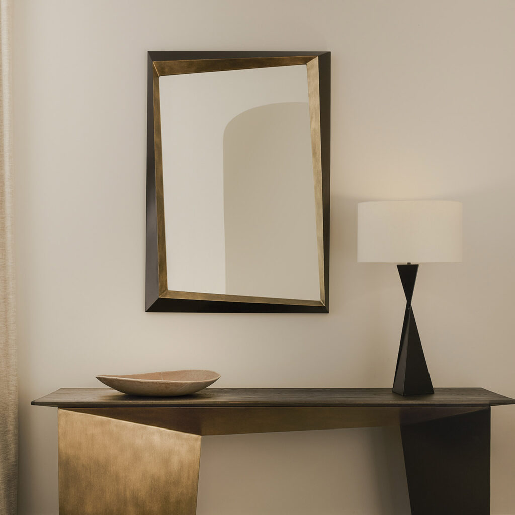 Our Phoenix design has its roots in the Cubist and Abstract art movements. The fittingly asymmetrical format brings an added element of dynamism that makes this a true statement mirror. The Phoenix has a touch of optical illusion to it, infusing the piece with a slightly off-kilter yet perfectly polished character. You have a choice of black or gold finishing, as well as the option of antiqued glass for an added touch of originality. To see all the options, have a look at our Finishes & Materials page. To create a cohesive effect, pair this mirror with other pieces from the Phoenix collection, like the round dining table or hanging pendant lights.