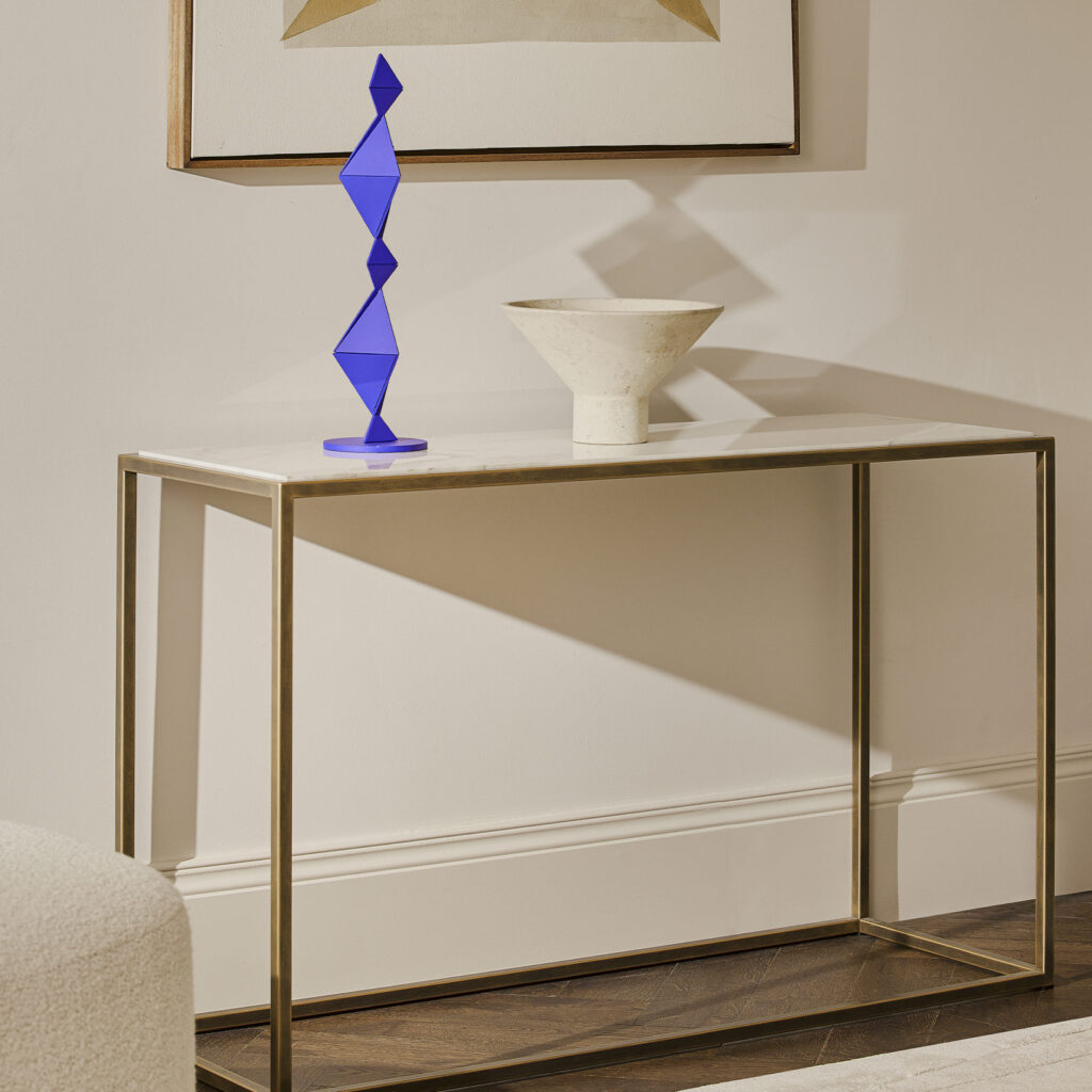 Siena is a beautiful console table with solid lines that make a real impact. It’s smart, elegant, and practical, working seamlessly into both traditional and contemporary interiors. As part of our ever popular Avenues collection, it’s a simple yet perfectly formed design that’s built with quality and versatility top of mind. The Siena console table can be made to any size and the top can be inset with glass or marble, with various beautiful options across both categories. The frame is available in a selection of our standard and specialist finishes, as well as polished stainless steel. You can peruse our full offering of finishes and materials here. If you do opt for marble, we’d advise you check out our tips on How to Care for Your Marble Tabletop.