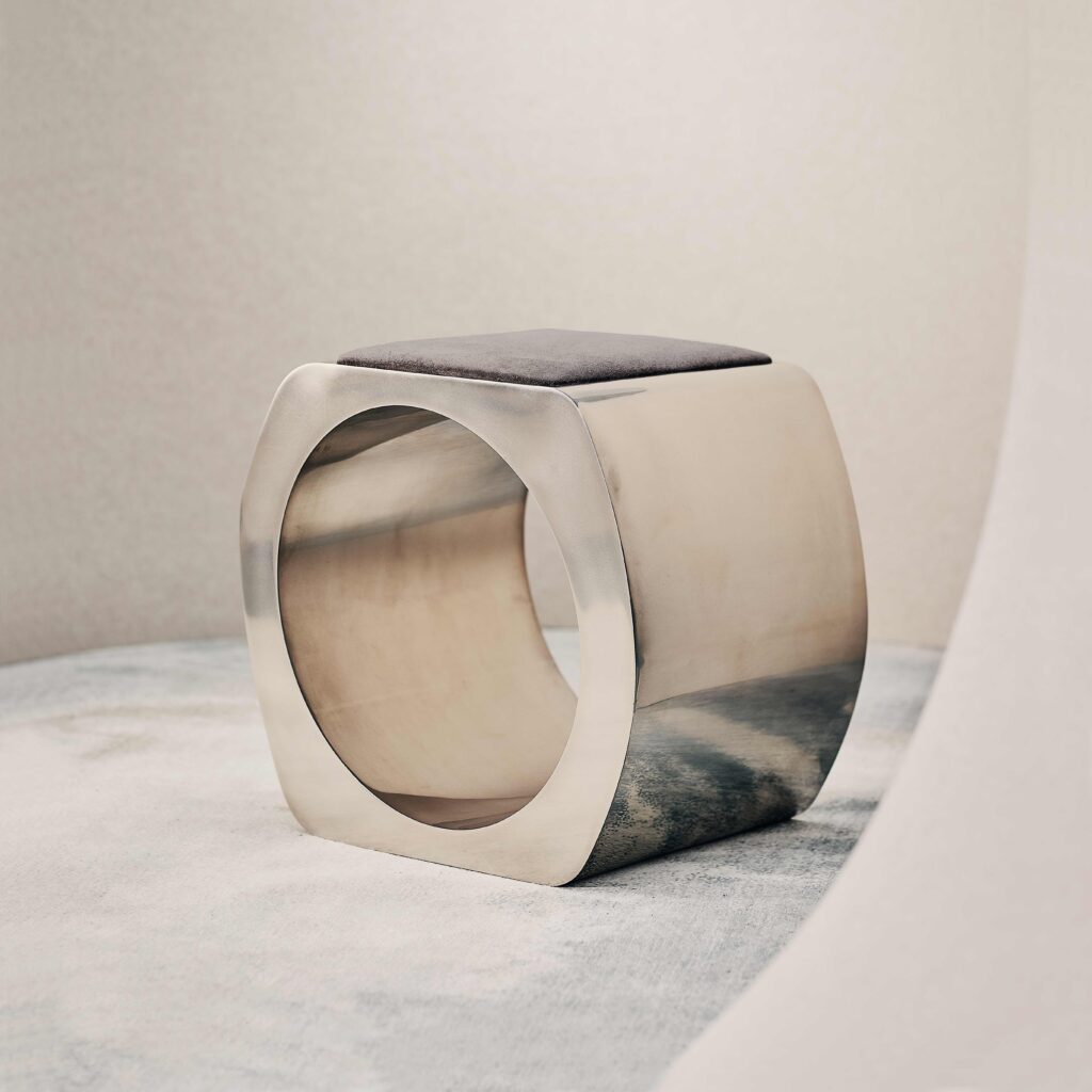 This iteration of the Skye stool combines crisp polished steel and plush upholstery to create a distinctive piece of contemporary furniture. Each stool is made to order, first bending sheets of steel to create the perfect form, then welding them together before rendering each join invisible. The upholstered seat is inlayed to create a clean effect, while adding a touch of warmth and tactility. The result toes the line between sculptural art and functional furniture, producing an eye-catching work of contemporary design.