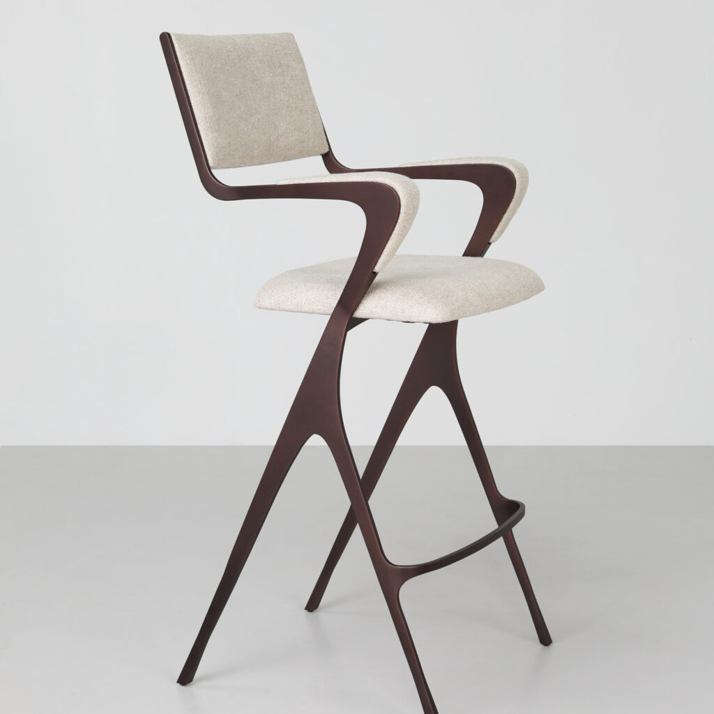The Vienna design takes on a svelte, elongated format in this modern bar stool with arms and a footrest. It’s a stool designed to sit back and enjoy, rather than perch in tentatively. The piece draws upon the elegant, curvilinear qualities of the Art Nouveau, giving them a sleek, modern update with a dynamic silhouette. The legs are water cut from steel plate, imparting strength and allowing for laser-focused precision. We’re happy to produce the piece as a bespoke bar stool in your choice of standard finish and upholstery (COM) or leather (COL). To delve deeper into our range of stools, we invite you to have a look at our Journal.