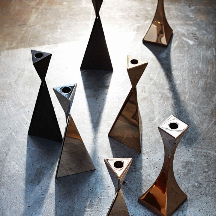They come together to create a beautifully cinched form, carefully calibrated for a perfect fit. These are geometrically entrancing pieces of metal furniture and home accessories, which appear to balance effortlessly. They take on a clean and contemporary look in our standard finishes, working wonderfully in a modern, minimalist interior.
