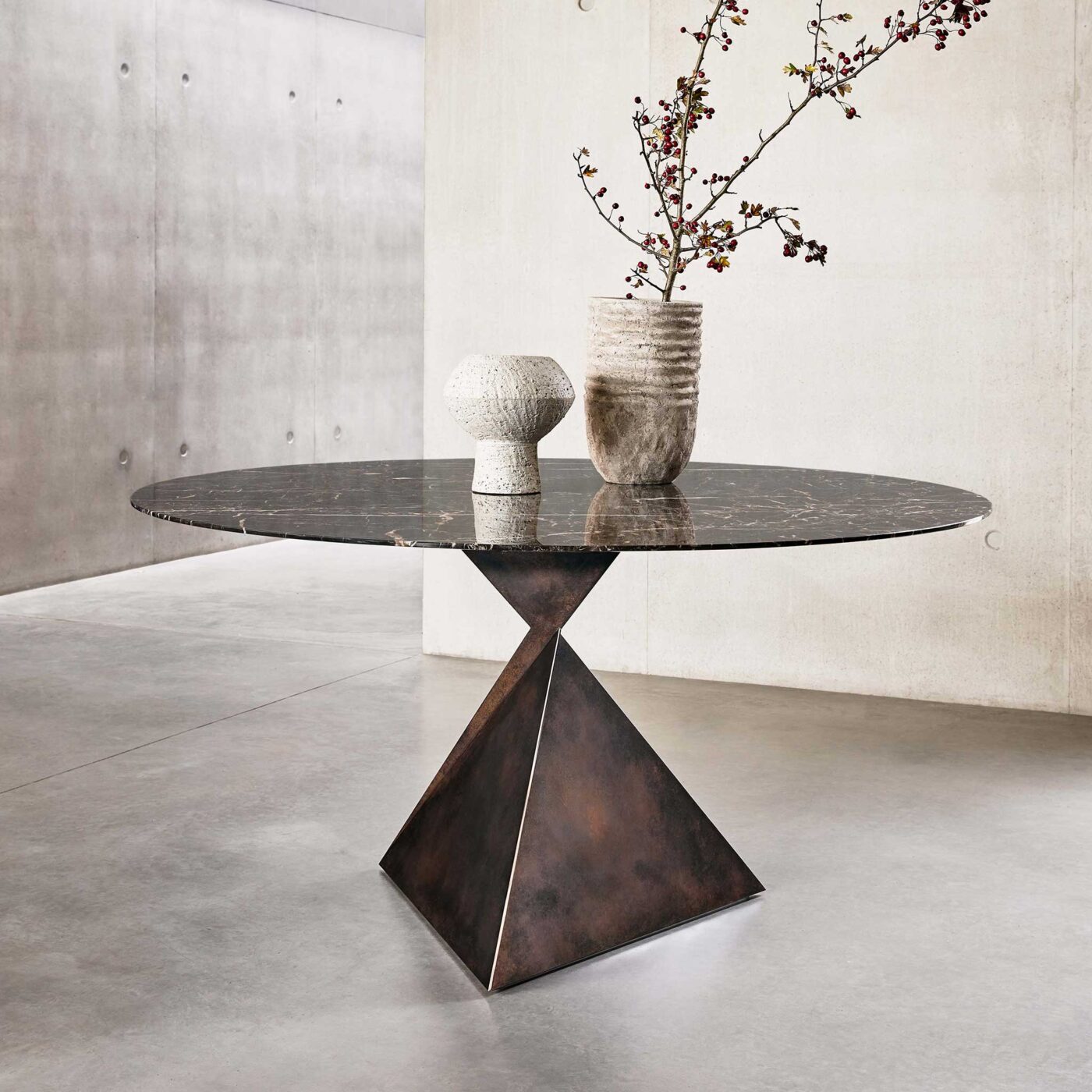 They come together to create a beautifully cinched form, carefully calibrated for a perfect fit. These are geometrically entrancing pieces of metal furniture and home accessories, which appear to balance effortlessly. They take on a clean and contemporary look in our standard finishes, working wonderfully in a modern, minimalist interior.