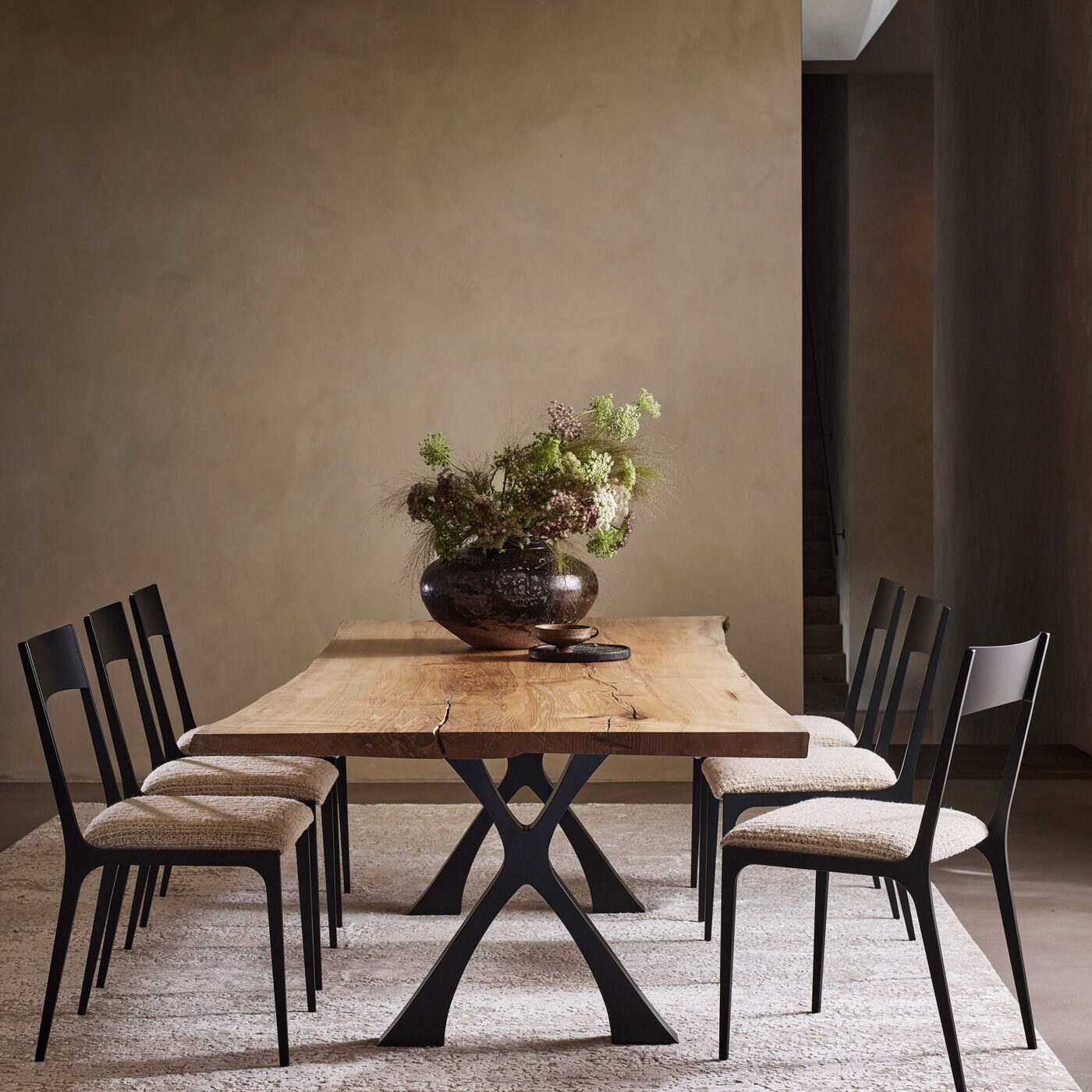 The Exe design reimagines the traditional refectory table, casting it in sleek materials formed with precision for a modern edge. The rectangular dining table is the foundation of this collection, with an expansive wood top supported by a pair of weighty metal exes. Each metal base is crafted with balance and finesse, introducing an element of softness through subtle curves which meet at crisp edges. The dining table finds its counterpart in the matching bench, designed to combine for a casual feel. The pedestal table is grounded by a carefully conjoined nest of legs, giving this iteration a slightly futuristic look while remaining true to the collection’s roots.
