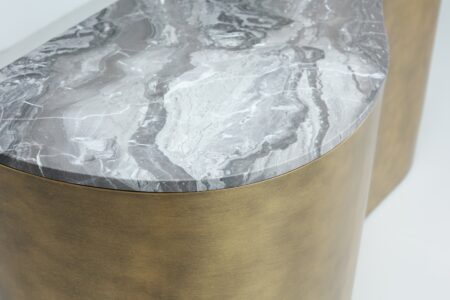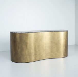 The Lily console table is brand new to our collection. Tom has deconstructed the classic shape, taking a cross-section of the footprint to highlight just one half. One side sits flush with a wall or perhaps the back of a sofa, while the other places the Lily’s undulating curves on full display. The piece, like all Tom Faulkner furniture, is made by hand in our own Wiltshire workshop. We take a meticulous approach to combining the rolled steel base with the material of your choice on top. They sit flush with one another to create a clean, minimalist look. We’d recommend opting for a hand-painted specialist finish on the base as this form shows them off especially well. As for the top, you can choose between a wealth of options for a bespoke console table tailored to your project.