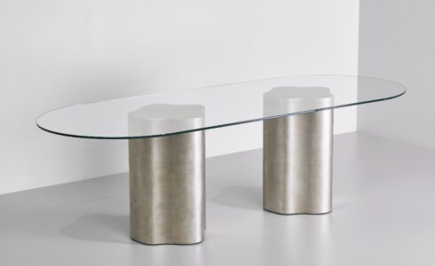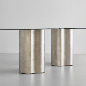 The Lily double pedestal iteration is a large lozenge-shaped dining table with a distinctly sculptural quality. Its long sides and semi-circular ends offer the perfect format for entertaining. It brings everyone in close and allows for clear lines of sight throughout the group. A crystalline glass top amplifies the unobscured effect, showcasing the twin bases below. You can also opt for other materials on top should you wish to add a dash of texture and complexity to the design. No matter how you customise this dining table, it remains a clean and captivating piece of furniture that brings a spark to modern interiors.