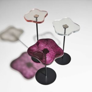 Lily cocktail tables finished in ‘Anthracite’ with ‘Peach’, ‘Clear’, and ‘Amethyst’ Venetian glass tops