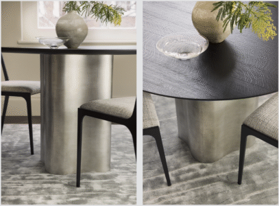 Lily single pedestal dining table finished in ‘Persian Silver’ with an Ebonised Oak top + Jak chairs