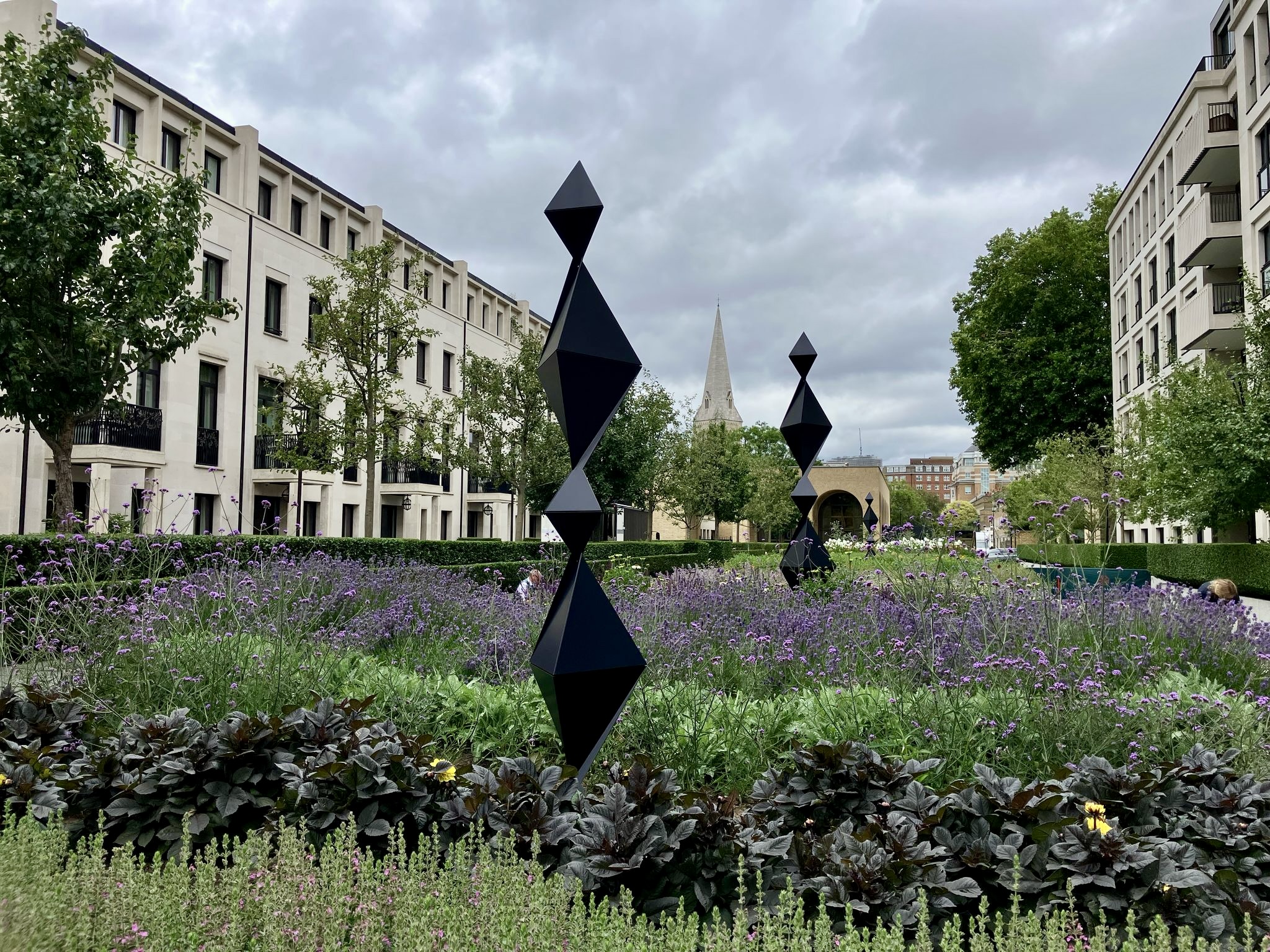 There are several sculptures throughout the courtyard. The geometrically striking Arizona needles are made of stainless steel and finished in a bespoke ‘TF Navy’, before being polished at the edges to add a spark of definition, even on cloudy London days.